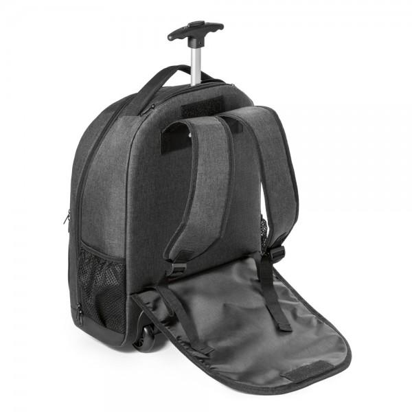 Mochila trolley para notebook em 600D de alta densidade e poliéster 600D impermeável. Possui um compartimento principal para notebook até 15.6’’, um bolso frontal com zíper e bolsos laterais em tela mesh. Mochila trolley com protetor de rodas e pega extensível em metal. Parte posterior e alças almofadadas. Placa metálica removível com imã para fácil gravação.